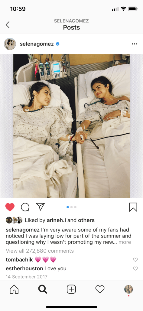 This shows us how perfect of a celebrity Gomez is to speak about the cause. She has one of the largest followings on Instagram with a total of 175 million followers making her the 3rd most followed person on Instagram in 2020 having dropped from 1st in 2018. Due to her large fan following, she is able to promote awareness of the disease much quicker than other celebrities with smaller fan followings.