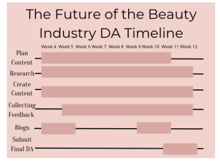 For my DA, I wanted to focus on the future of the beauty industry. This meant doing research on topics of interest and explaining them in a blog post while also posting TikTok videos to compliment my blog posts. I initially anticipated creating weekly research with a blog post and a minimum of one TikTok video. This changed as I realised my timeline was overestimated. This was all outlined in my pitch.