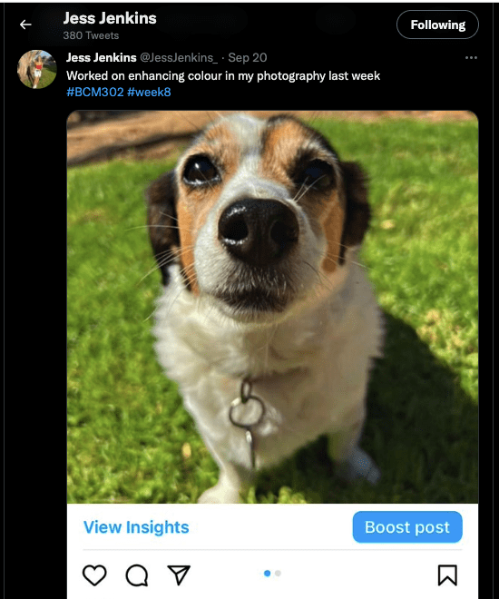 Jess has documented her weekly progress update on Twitter in the form of tweet updates with images of the progress she has made or the work she is editing. This was an excellent way to document the progress but I believe that she could have benefited from further interactions on Twitter to promote her Instagram page. I feel this DA could be improved with a collaboration from anyone from the creative services team to provide feedback on her DA or to elevate the experience of the viewer of the page.