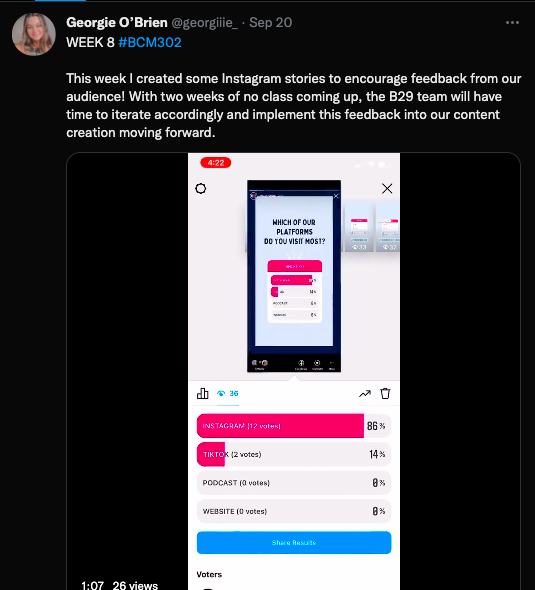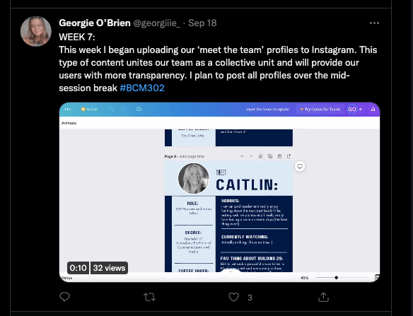 Georgie’s DA is already underway with the rest of the Resources Building 29 team. Georgie’s role within this group is the social media content producer and visual design manager. She has used her Twitter weekly updates to promote the UOWbuilding29 Instagram page as she has been creating posts that can be found on the page. I feel as though the page has a strong brand and aesthetic which with the continued development of the social media page should hopefully be recognisable amongst all UOW students in the future.